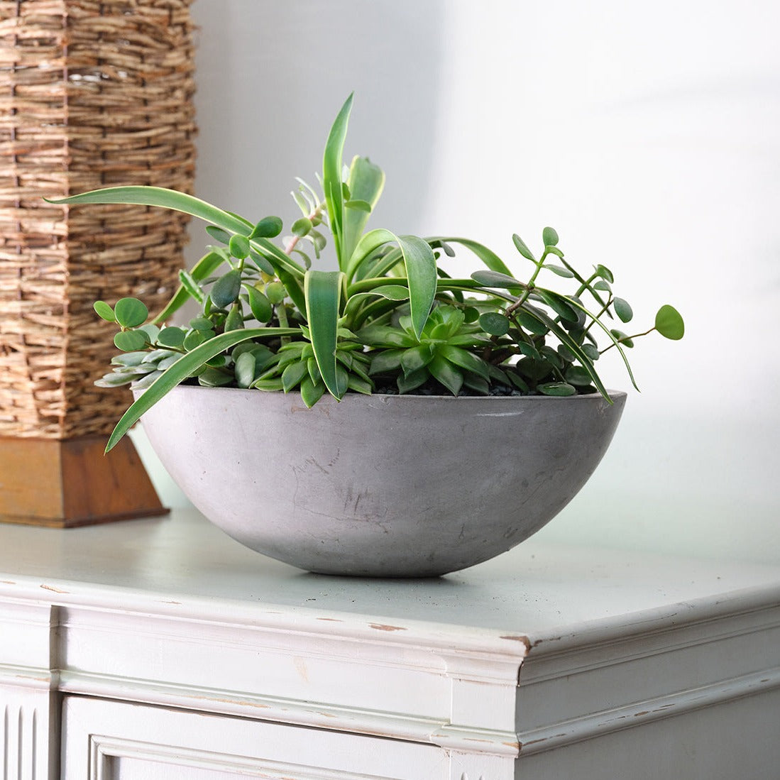 Our terrarium planters are designed with the same “layers” as our enclosed terrariums. This technique allows us to plant in any container without requiring a hole for drainage. The layers provide natural drainage within the planter which protects your furniture and allows for ease during regular watering. Our Joel terrarium planters are built for indoor locations with plenty of indirect sunlight.