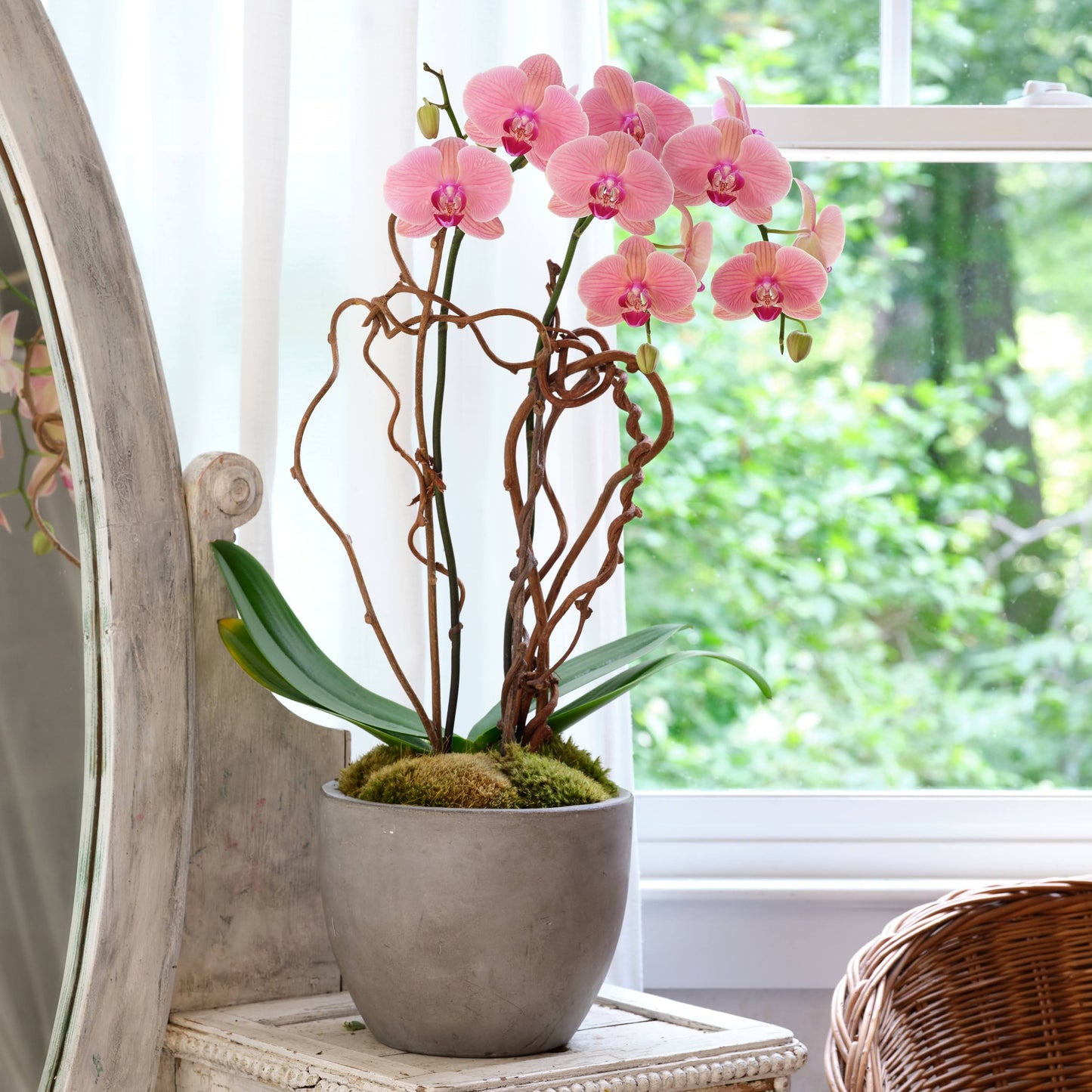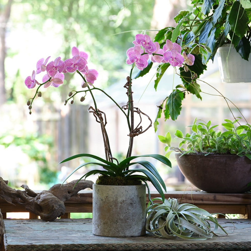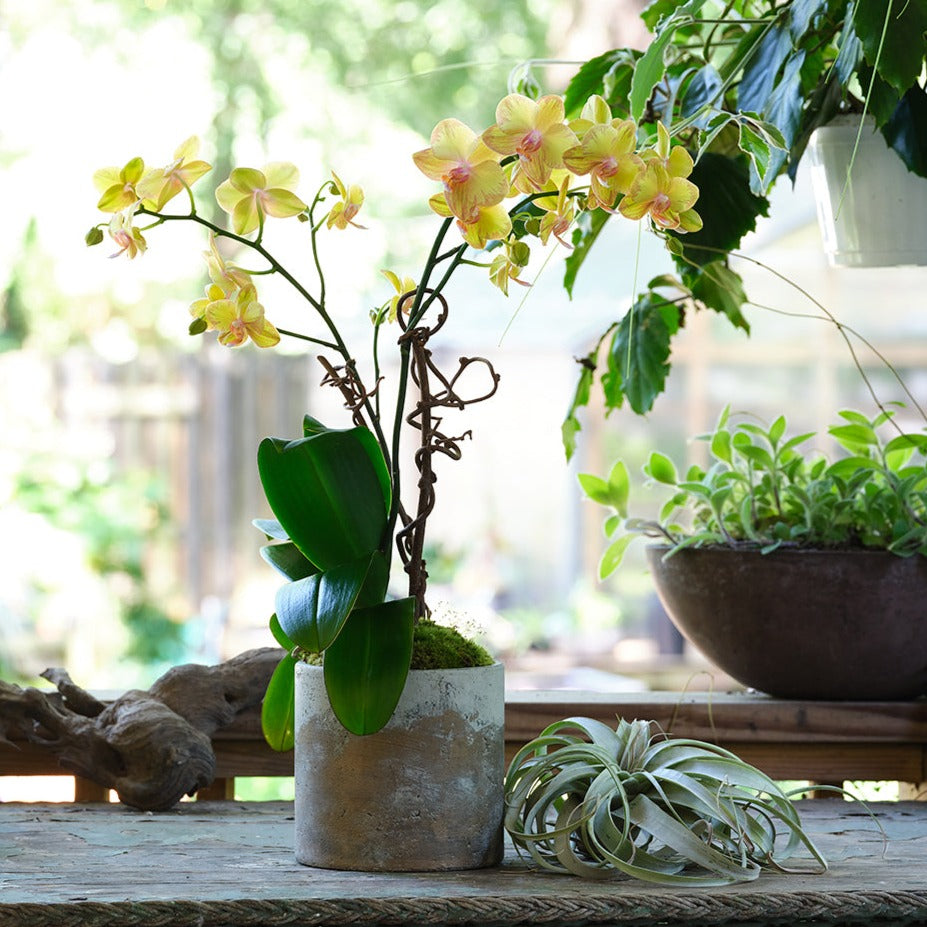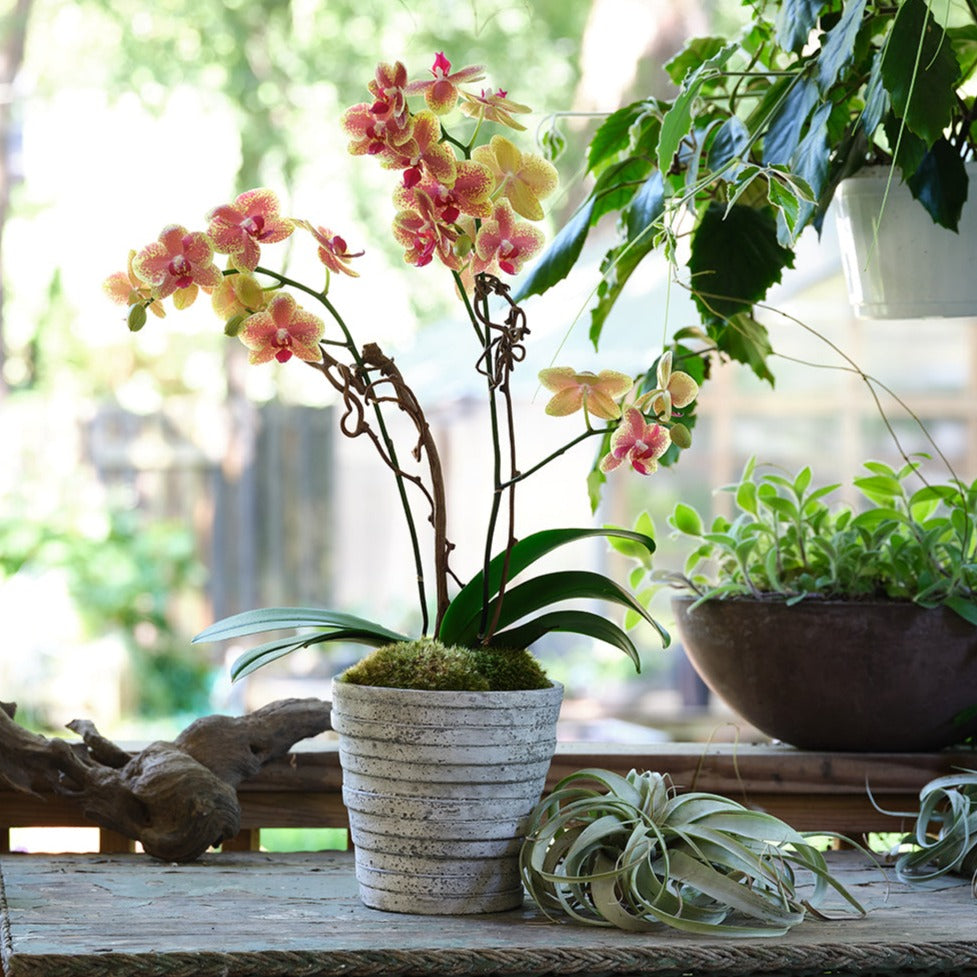 Novelty potted double spike orchid displayed in our signature vessel with kiwi vines and lush green moss. Color and vessel vary based on availability. If you have a preference, please let us know in the special instructions and we will do our best to meet it.