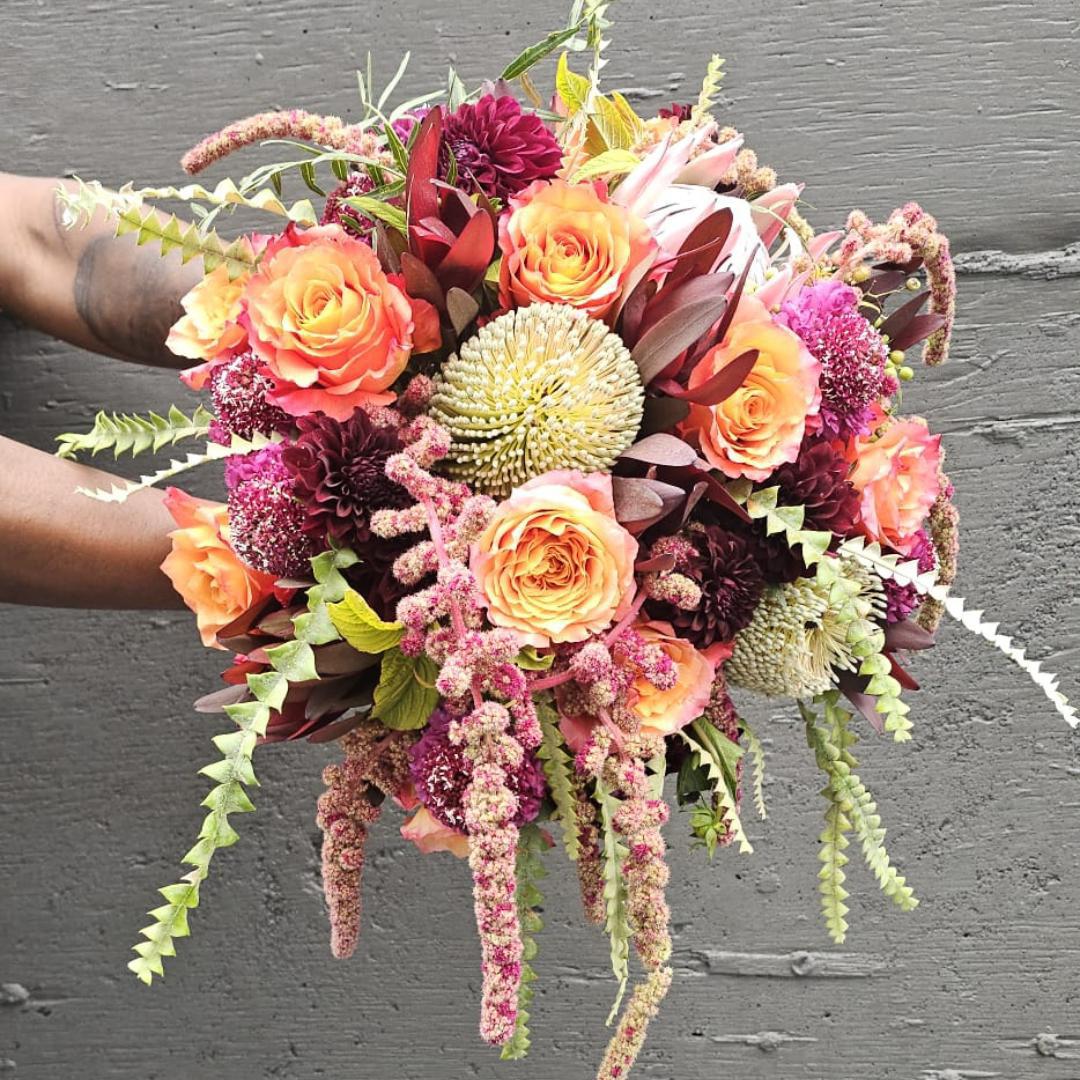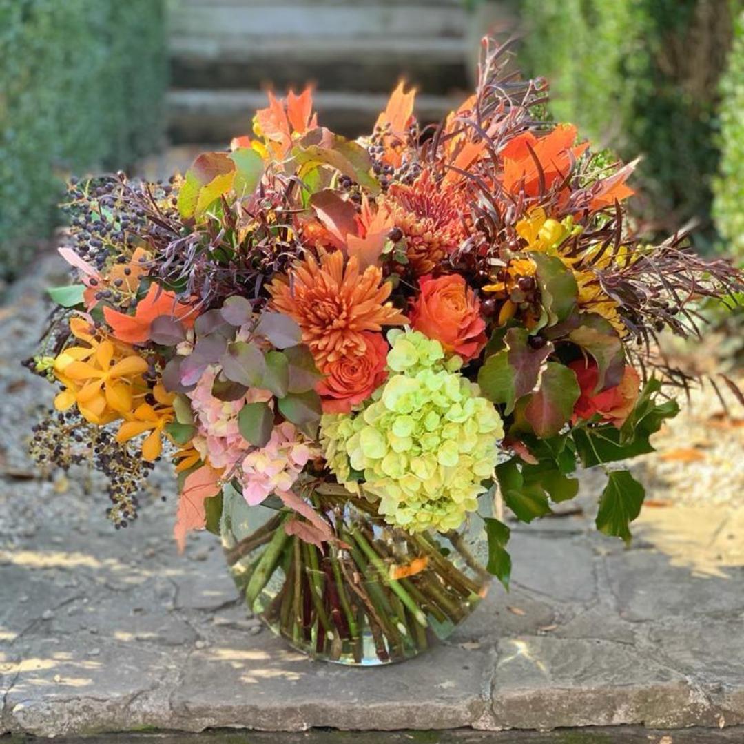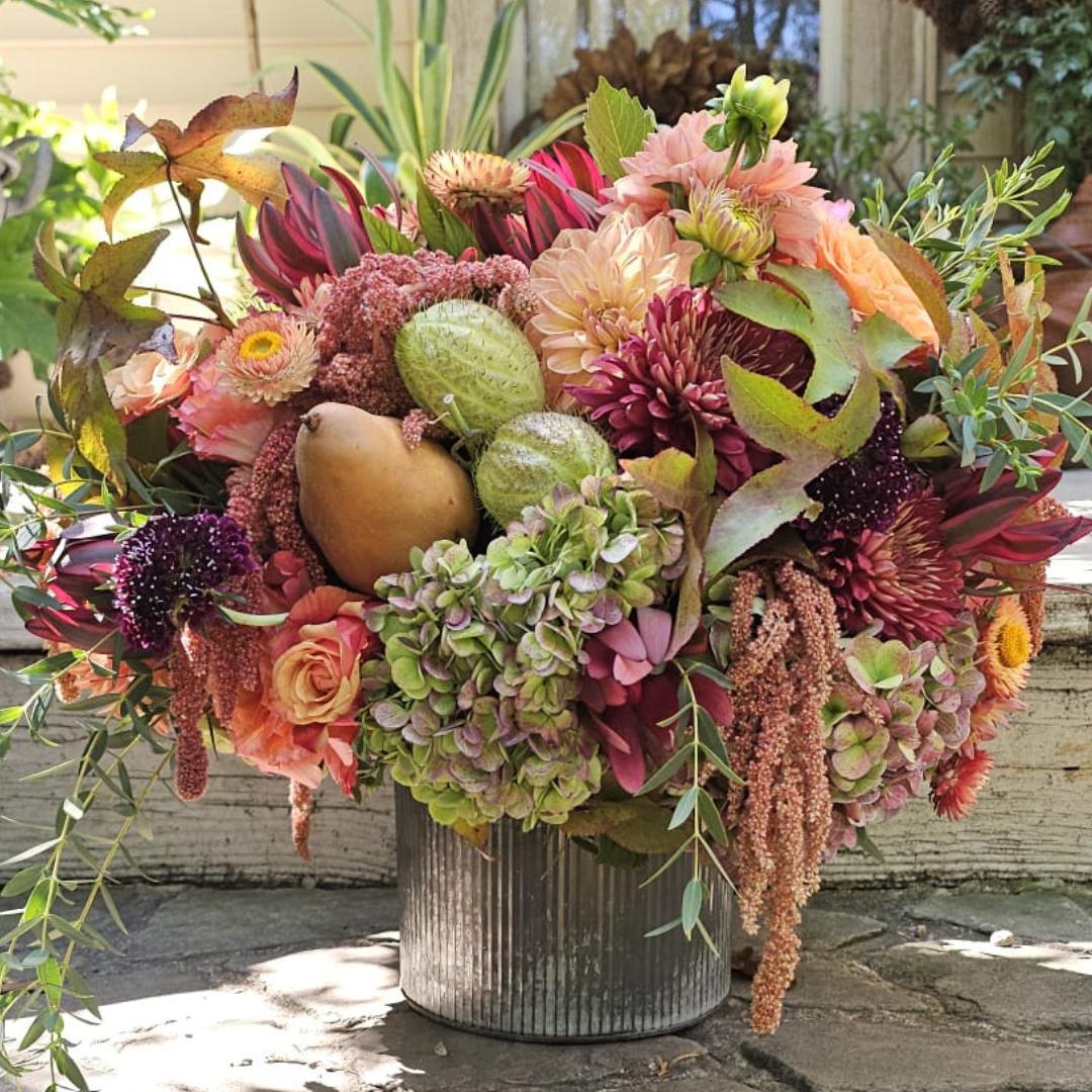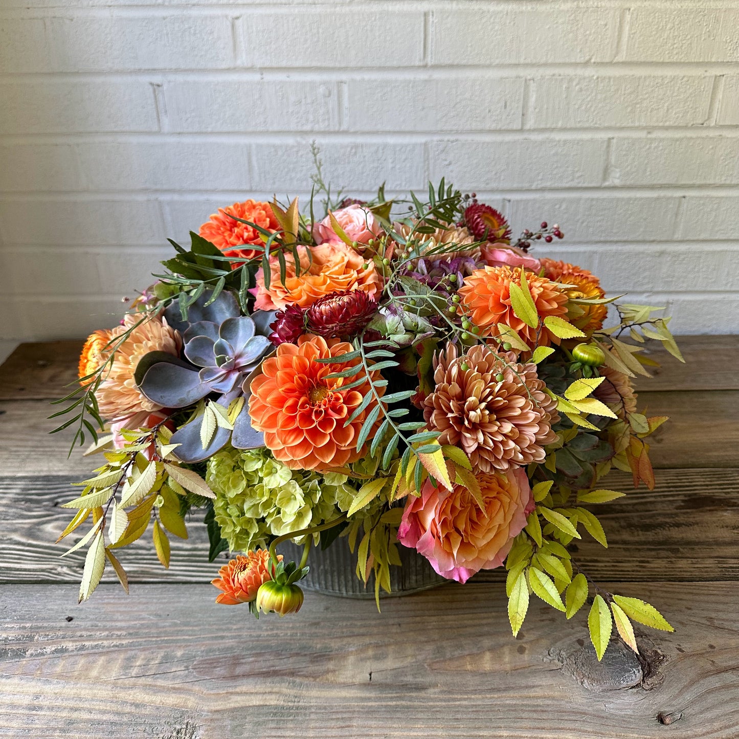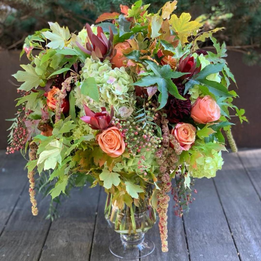Experience the seasonal charm of peach, gold, and burgundy flowers and textured foliage elegantly designed in the vessel of your choice.