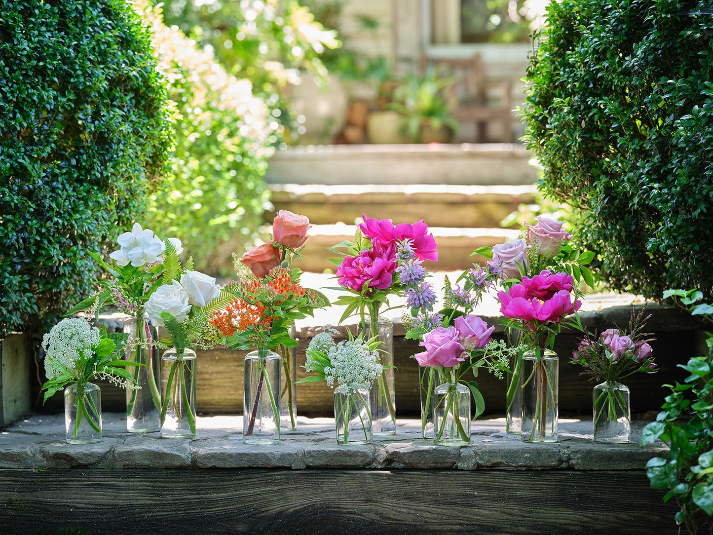 Petit bouquets of premium seasonal flowers and textured foliage wrapped in tissue and kraft paper and tied with raffia. Perfect for party favors and hosting gifts.