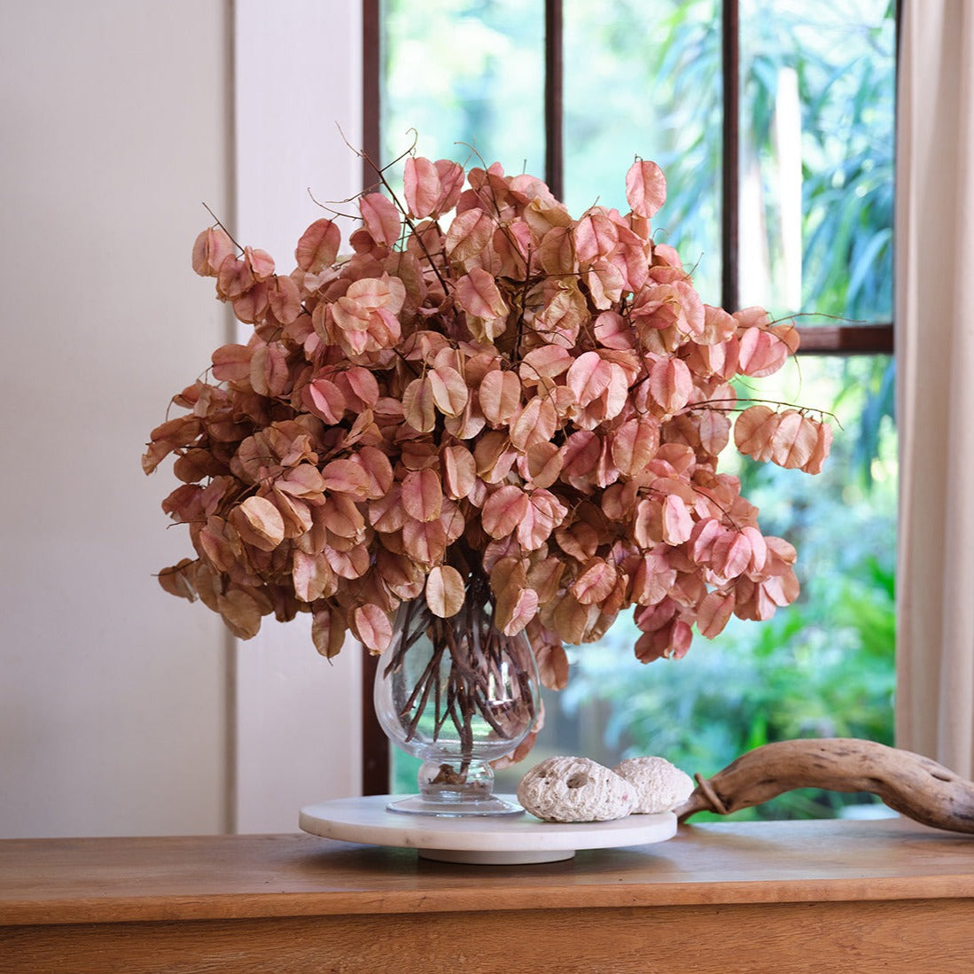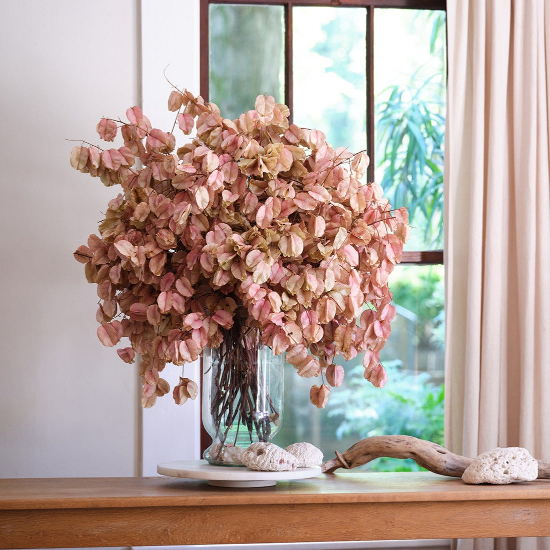 Compositions of naturally preserved Koelreuteria seed pods displayed in signature vessels.