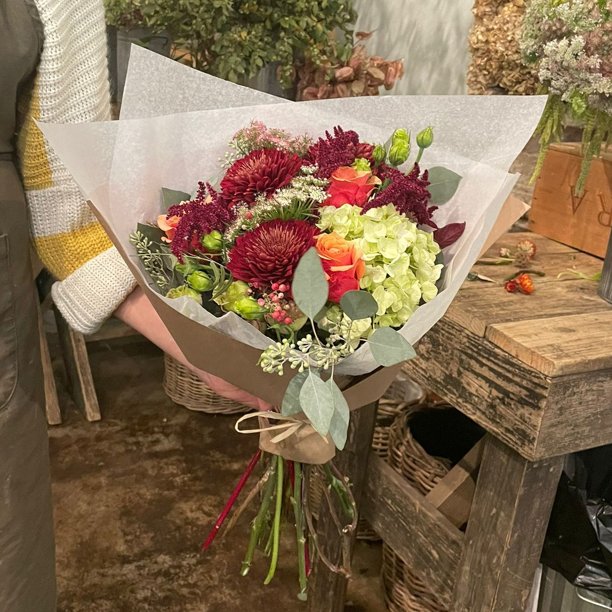 Featuring premium seasonal flowers and textured foliage wrapped in tissue and kraft paper and tied with raffia.Â